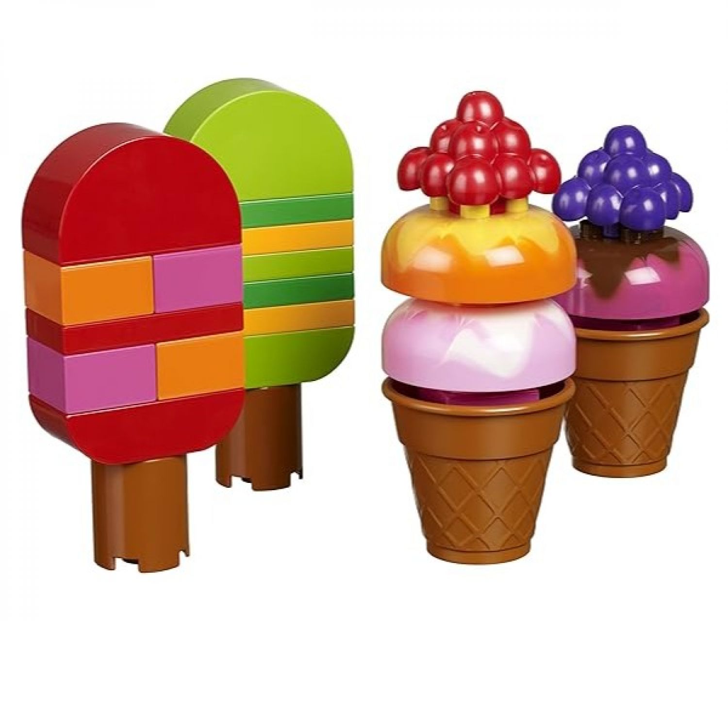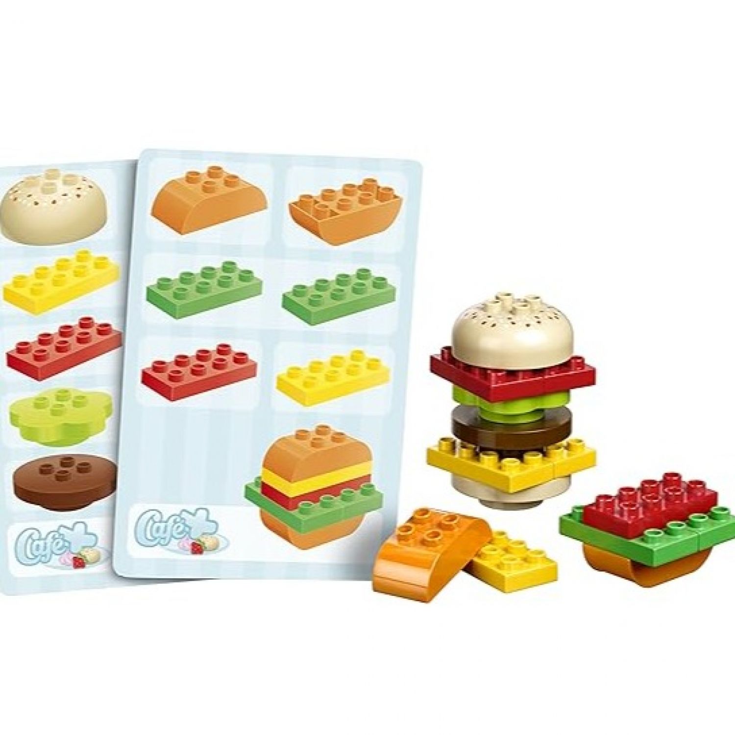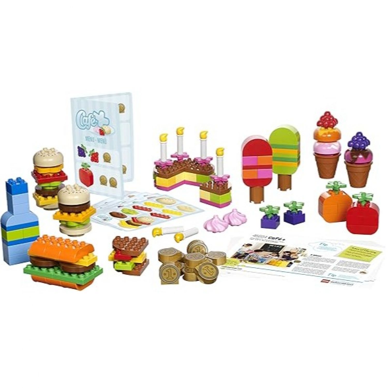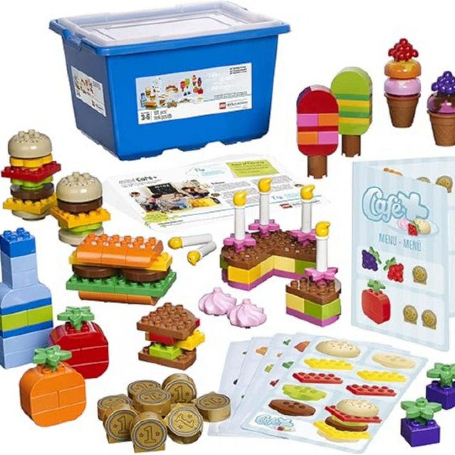This versatile set helps children to sharpen their skills in many areas, from exploring numbers, shapes and colors to understanding trade, money, social roles and building and following instructions. Use the menu card to order one of the items and then have the children build the item, just like on the picture. Have the children buy tow items so they can learn how to add up numbers. All parts in this set are brightly colored, large pieces with rounded edges and are therefore ideal of small hands. The product is designed for at least 4 children and comes with numerous ideas for activities. It contains 125 parts.