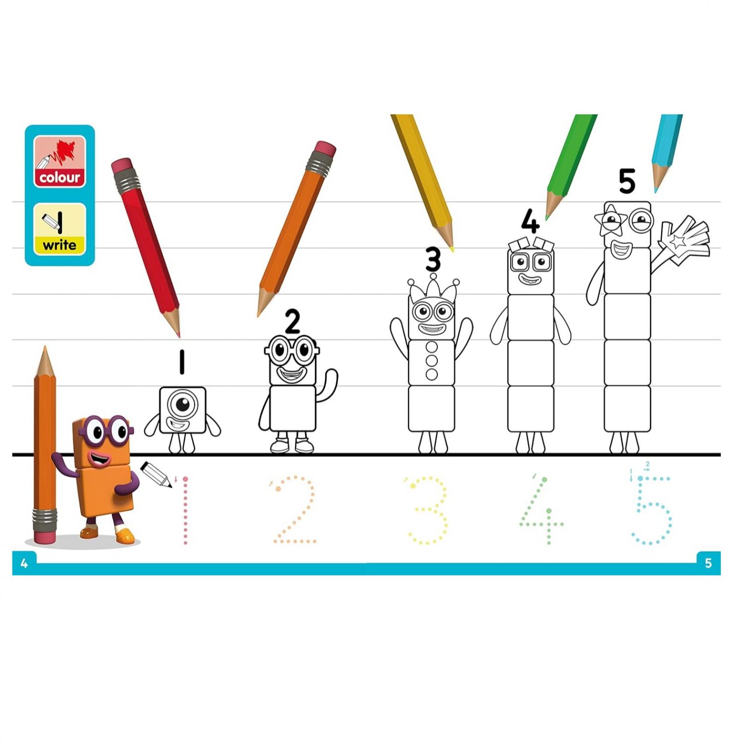 Get ready for fun colouring activities with the Numberblocks! Learn to write numbers, complete picture patterns, and search and find things in Numberland. Featuring Numberblocks One to Ten!