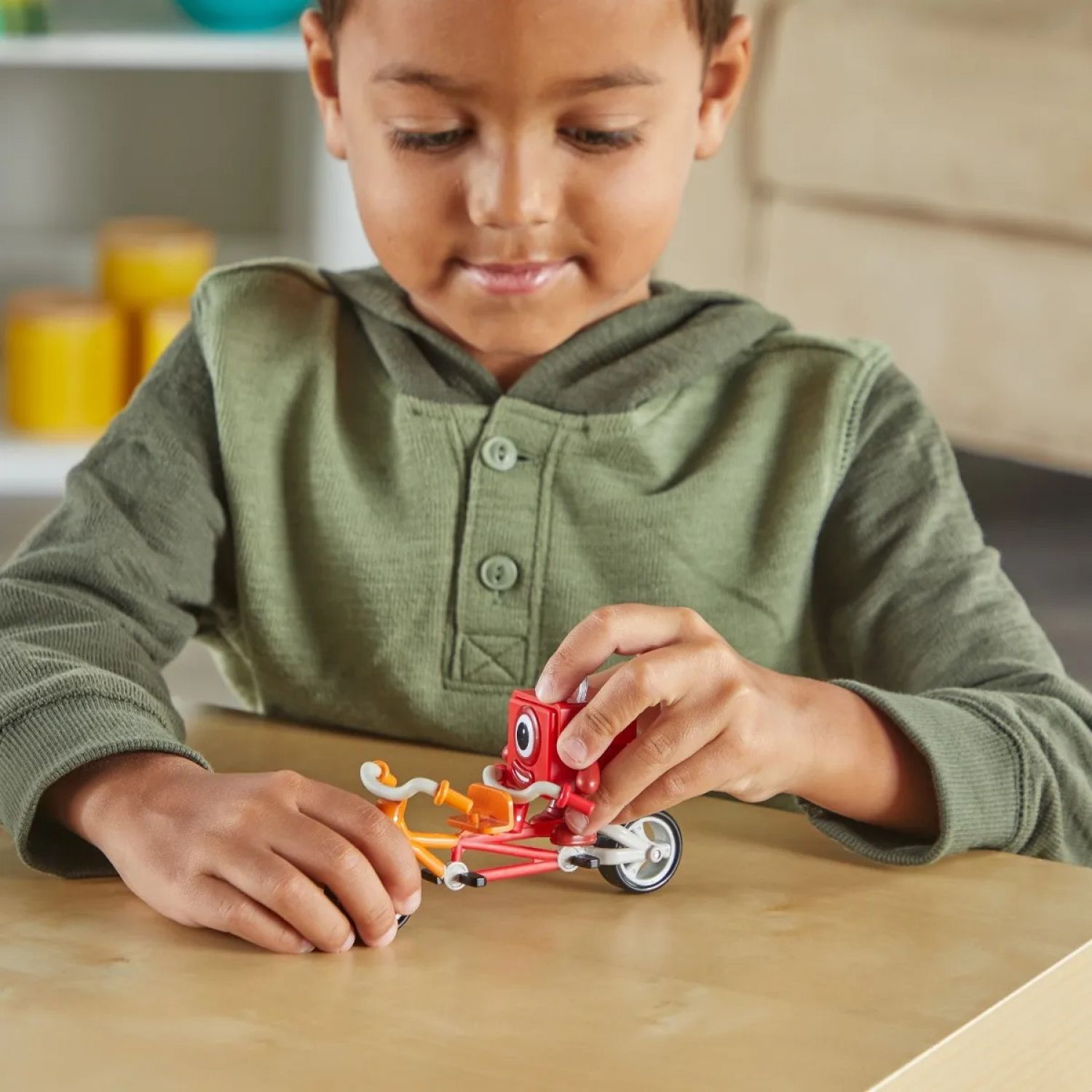 Learning Resources® Numberblocks® One and Two Bike Adventure. Imagine all the fun places two can go when riding in tandem! Designed with true-to-character details, these figures bring the loveable characters from the award-winning TV series to life. One and Two are perfectly sized for little hands, and children create their own adventures in Numberland by placing the numbered helmets on each Numberblock, and then wheeling them off on their tandem bike. These figures feature moving arms for dynamic posing for play. Includes Numberblocks® One and Two with matching helmets, and tandem bike with turning wheels. Features multilingual packaging. One measures 5.5cm H. 5 Piece Set (Ages 3+)